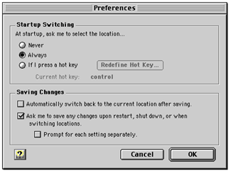 The Location Manager includes three different ways to switch locations. Before you close the application, you can choose the Preferences command from the Edit menu. The Preferences dialog box, shown in Figure G, lets you display a dialog box at startup that prompts you to choose a location.