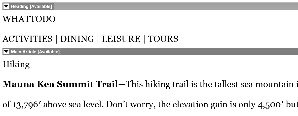 Those gray bars can be a bit overwhelming. By default when you open an InDesign document or Assignment, every story is expanded forcing you to scroll down the page to see the various stories that are available. If you option+click (Mac OS) or alt+click (Windows) on a triangle located on the left side of the gray bar in an expanded story, it will collapse all stories except the one in which you click. Expand another story by clicking on the triangle, then option click on the triangle again to collapse all but the current story.
