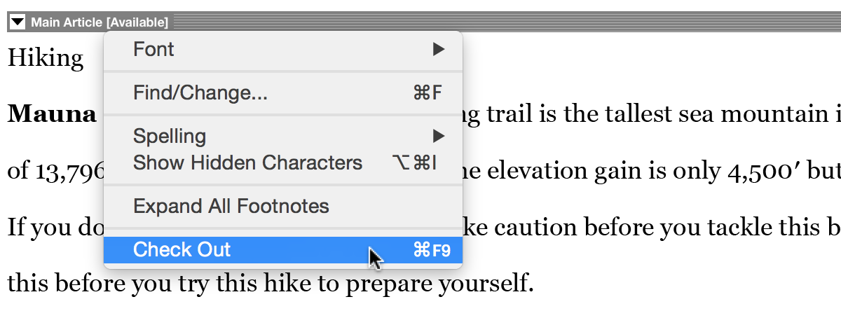 That gray bar not only tells you the name of the story, but did you notice that it also let’s you know if the story is available to check out or not. That is convenient information to see at a quick glance. You want to check out the story to work on it? Simply right-click anywhere in the story and choose Check Out.