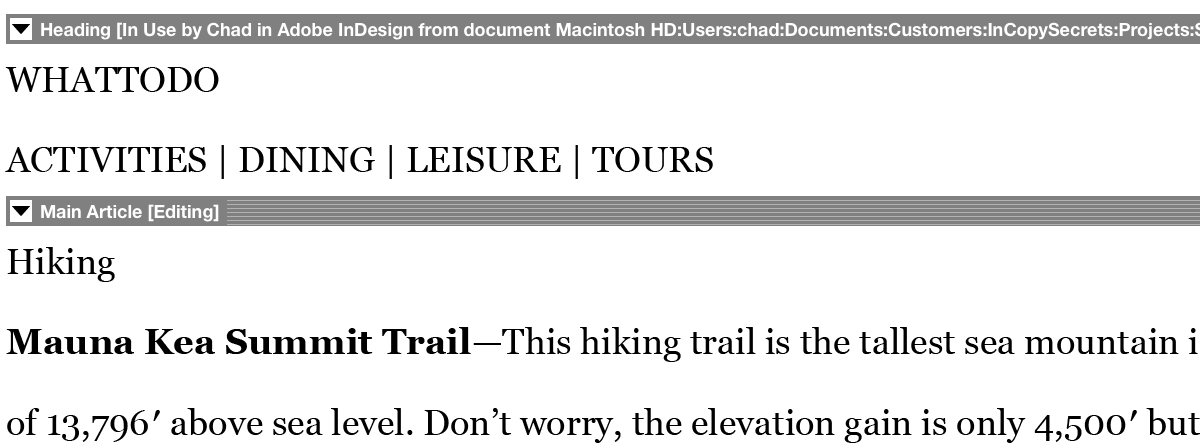 Realizing that there were some great features right in front of me has caused me to work a little bit differently in InCopy and a little more efficiently. I hope these techniques help you to work a little faster and more efficiently as well.