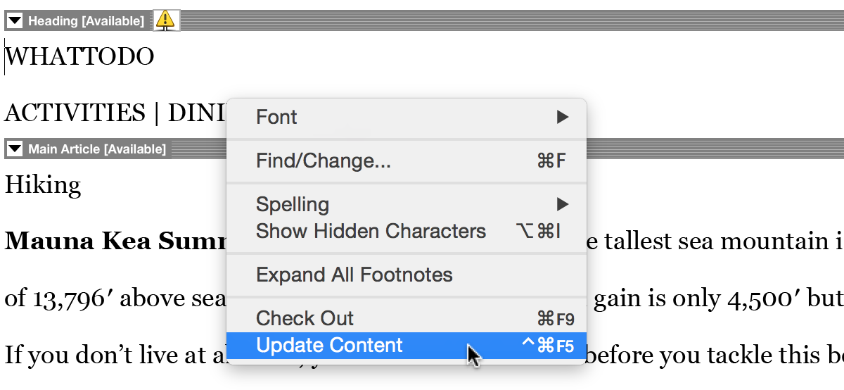 Checking in content is equally as easy, simply right-click anywhere within a story and choose Check In. Galley and Story view also show you if a story is out of date, and provides an easy way to update that content if needed. Just right-click and choose Update Content.