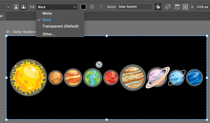 By default, artboards are transparent in output, but you can apply a fill color that will appear in output. To set the fill color of an artboard, select it and choose Fill in the Control panel or Properties panel. You can choose Black, White, or Other and use the Color Picker.