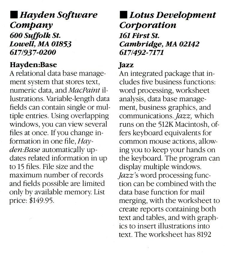The editorial content of Macworld was divided between columns/departments (commentary, short product reviews, etc.) and feature sections containing longer articles. Each of these sections opened with a major article that had a distinct look: two 19-pica rag-right text columns, always headed by either 54- or 84-point Garamond Book titles. Despite these prescriptions, the layout of every lead feature’s opening spread was unique, as shown in Figure 4. The text throughout the magazine was set in 10-point on 11 points of lead.