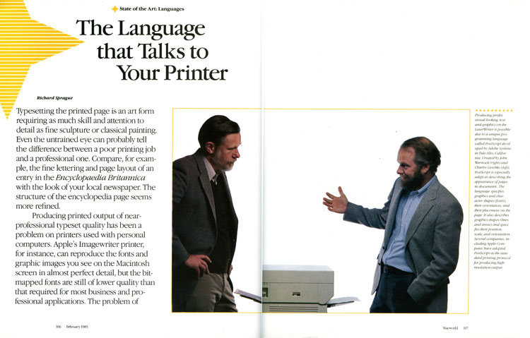 Spiegelman’s earlier work on sister publication PCWorld (1983) demonstrated two things: A computer magazine could have a classy, high-tone look, and a single four-member typeface family—Jan Tschichold’s Sabon, in this case—could be leveraged to produce a sweeping array of typographic effects.
