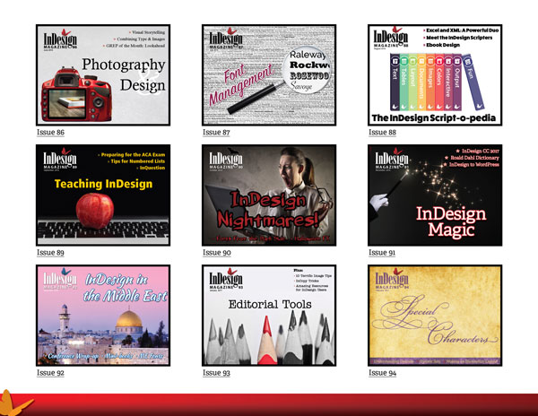 This is a page from a layout showcasing the covers of all the issues of InDesign Magazine. When this document was built, a 3 pt stroke was applied to the frame for each cover image. Now, as you look at the document, you decide that the stroke is too wide, and you’d like to reduce it.