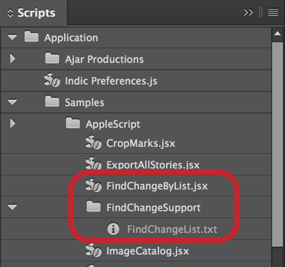 Every copy of InDesign comes with a script called FindChangeByList. This script allows you to define multiple find/change queries that are performed when the script is executed. To see the script, choose Window > Utilities > Scripts. Within the Scripts panel, click on the disclosure triangle to open Applications > Samples > Javascript. Within that folder you’ll see the FindChangeByList.jsx file as well as a folder called FindChangeSupport that contains a file called FindChangeList.txt (Figure 17).