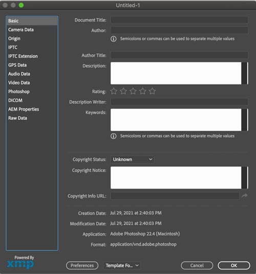When you can scroll through 12 categories on the left side of the dialog box, the corresponding metadata fields and the data for your file appears on the right. In some cases, you can edit this data as well, depending on the program and the document file format you’re working with. For instance, in Photoshop, if you open any image taken with a smartphone, the file will already contain both camera information and shot information in the Camera Data fields. You can’t edit those.