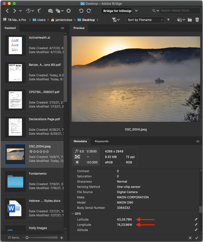 But Bridge also has another feature: the Metadata panel. Not only can you view, add, and edit metadata in your files using the Metadata panel (Figure 2), you can also edit metadata that you can’t access using File Info. For instance, only in Bridge could I edit the GPS metadata settings for latitude and longitude of Lake Pleasant, New York, where I took the shot in Figure 3. In the Metadata panel, you can edit the data of any field that shows a pencil icon.