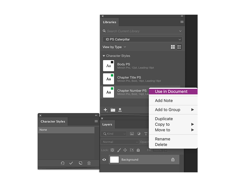 Figure 8. Right-click on each character style in the library to import into Photoshop, and choose Use in Document.