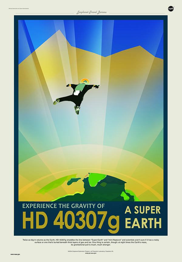 The three posters depict the virtues of traveling to places with names like Kepler-186f, HD 40307g, and Kepler-16b. Kepler-186f orbits a cooler, redder sun than our own, leading NASA to speculate that any plants would be more red than green. Featuring two space-suited explorers and a white picket fence, Kepler-186’s poster boasts the tagline, “Where the Grass is Always Redder on the Other Side!”