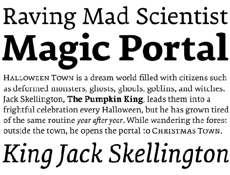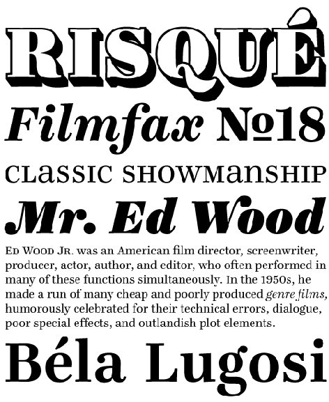 The Modern typeface classification is usually associated with Didones and display faces that often have too much contrast for text use. The Ingeborg family was designed with the intent of producing a Modern face that was readable at any size. Its roots might well be historic, but its approach is very contemporary. The three text weights (Regular, Bold, and Heavy) are functional and discreet while the Display weights (Fat and Block) catch the reader’s eye with a dynamic form and a whole lot of ink on the paper. The family includes a boatload of extras like unicase alternates, swash caps, and a lined fill.