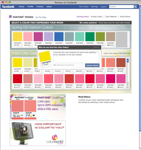 Feeling a little blue? Maybe fiery red or sunny yellow? With Pantone Moods, Facebook users now have the ability to choose the Pantone Color that best suits their mood and have it display on their profile page with a brief caption.