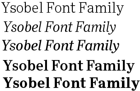 Development began with the text version of Ysobel, which comprises eight fonts. All weights feature lining and old style numerals, fractions, superior numbers and extended Latin language coverage. Small caps are also available in the Ysobel Pro Regular font. The 12-font Ysobel Display Pro family is a completely redrawn version of Ysobel; it is narrower and features other nuances for improving the design’s appearance at large text sizes.