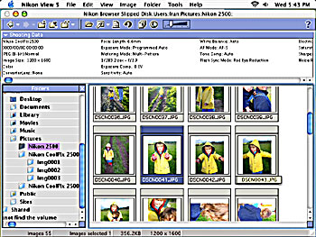 The Coolpix 2500 ships with Nikon View 5, the same image cataloging software supplied with its high-end digital cameras. Nikon View 5 is the best of the image catalogers supplied with the current crop of digital cameras, but I did run into a bug that caused it to crash on any dual-processor Mac. The PC version worked without a hitch, and Nikon plans to release an update to fix the dual-processor Mac bug in the near future (see figure 7).