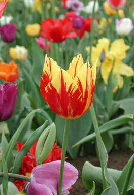 Setting the aperture manually lets you adjust depth of field. Here the background is intentionally blurred, with the focus on the tulip at center.
