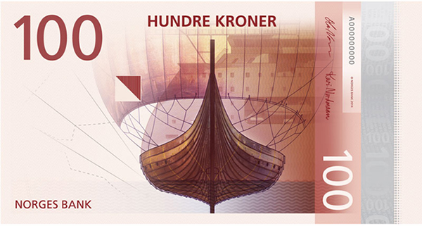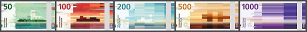 Tasked with the direction to build on a theme of “The Sea,” graphic design firm The Metric System provided elegant depictions of typically Norwegian objects: a Viking ship, a lighthouse, a fish. Their designs—though not finalized—will grace the front of the notes, which come in 50, 100, 200, 500, and 1000 kroner (NOK). The samples provided were rendered in beautiful tones of gold, green, purple, red, and blue in keeping with the current color scheme so as not to add confusion when the new notes are released in 2017. Their proposal for the reverse of the notes included further representations of Norwegian life, revolving around the central theme of the sea. In the end, Norges Bank opted for a combined approach, melding a traditional feel with a modern outlook.