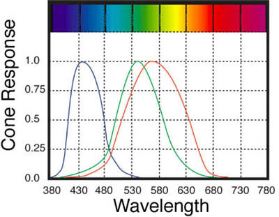 Figure 4: From left to right, the curves above show the sensitivity of the S, M, and L cones to various wavelengths of visible light.