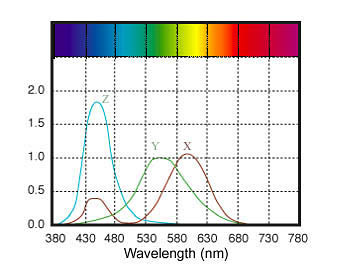 Figure 5: The CIE 1931 Standard Observer represents the color perception of a “normal” person. The curves show the intensity of X, Y, and Z values (akin to cone response) for a given wavelength.