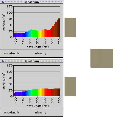 Figure 7 shows the same color samples plotted in Figure 6 as they would appear under incandescent room lighting. Incandescent light contains more energy at the longer wavelengths and less at the shorter wavelengths than does D65, so the first sample (which reflects more of the longer wavelengths than the second) appears redder under this lighting.