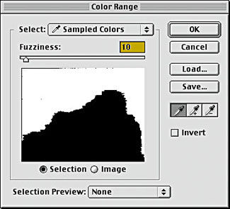 The first problem to fix is the sky. The unappetizing greenish shade is actually real, the product of a major forest fire some miles away, but it’s very hard for the eye to accept. Working in the duplicate image, I start out by making a simple marquee selection that includes all the sky, so that the color-range command has less work to do. Next, I choose Select > Color Range, set the Fuzziness slider to around 10, and shift-click in the sky to build up the selection (see figure 2).