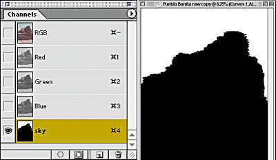 Next, I save the selection using Select > Save Selection, which creates a new alpha channel I name “sky.” Then, I select the sky channel in the Channels palette, hide the other channels, deselect, and clean up the various holes and blobs with the paintbrush. Finally, I run a Gaussian blur of around 2 pixels to soften the edge slightly, producing the result shown (see figure 3).
