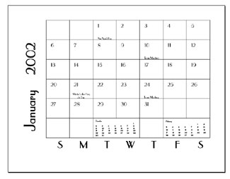 As you can see, the original layout of the Calendar 1 script isn’t too exciting and isn’t necessarily how you want your calendar to look. Since any changes you make have to be made to 12 pages, the easiest way to approach customizing this layout is to change the first page and then use styles to format the remaining pages.