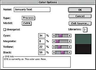 The next step is to add some color and graphics to the layout. These elements should match the theme you chose earlier. As mentioned, to help tie in our colors with our graphics, we chose two colors from each butterfly image to use as text and background colors for that particular month. To add these colors to the Colors palette, choose Window > Show Colors and then choose New Color from the Colors palette’s pop-up menu. In the Color Options dialog box, you can either enter the CMYK breakdown of the color, as shown in Figure H, or select the color from a library by clicking on the Libraries pop-up menu. Now name your color and click OK to add it to the palette. Repeat this process to add all the colors you want to use in your document.