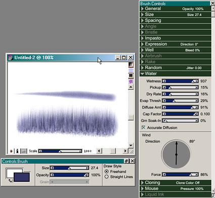 More cool stuff awaits the watercolor artist. A new sub-palette in Brush Controls adds advanced controls over watercolor effects such as diffusion amount, evaporation threshold, and diffusion. A common practice in watercolor is blowing on the paint to spread it in a particular direction, and the new Wind Direction control let us imitate this technique with amazing precision. Both watercolor and liquid ink are implemented as separate media layers.