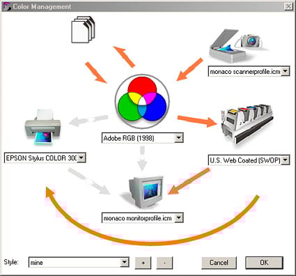 Painter 7 provides a visual guide to color management with its intelligently designed dialog box.