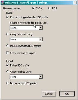 The advanced Import/Export controls in the Color Management dialog box let you control how ICC profiles are converted on import and embedded on export.