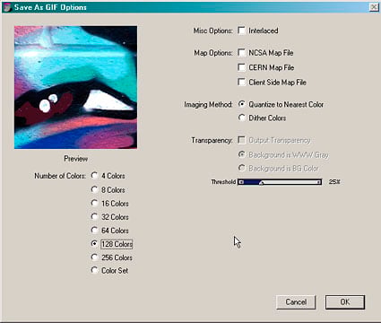 If you are saving files for the Web, you’ll find the new, live JPEG and GIF previews helpful. The dialog boxes provide a variety of options for saving these files, such as compression quality, map options, color reduction, and imaging method. You can view changes on the screen — a big improvement over the trial-and-error export in earlier versions. But you won’t find extensive Web-specific features in Painter — goodies such as sophisticated optimization and HTML output. We’ll call that version 8 wish-list item number 3.