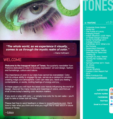 TONES, the new free quarterly newsletter from Pantone, is dedicated to color in its every expression: art and design, fashion and furnishings, culture and nature.