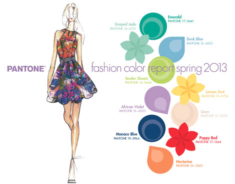 In conjunction with the kick off of New York Fashion Week, Pantone today unveiled their PANTONE Fashion Color Report for Spring 2013. The report features the top 10 colors for women’s and men’s fashion for spring, along with designer sketches, quotes, headshots, and recommended CMYK equivalents. Not surprisingly, trending spring colors include florals and fruits to evoke freshness, and growth.