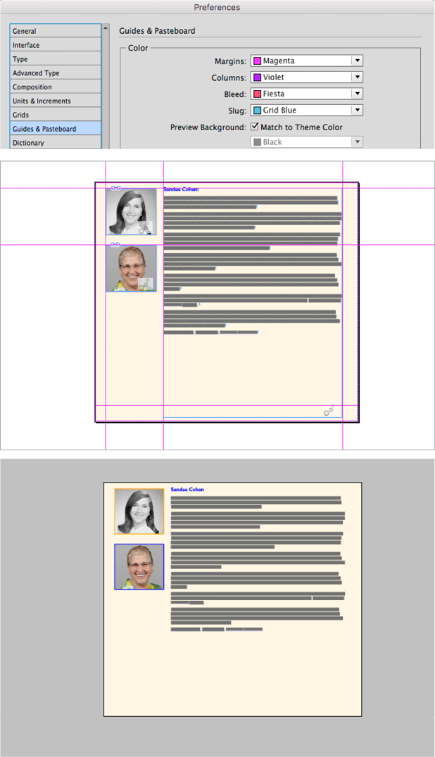 Like any tool, you need to have a clear view of the pasteboard in order to make the best use of it. In InDesign, you have several choices for changing the color of the pasteboard so it contrasts with the color of your pages. The first place to change the color of the pasteboard is under Preferences > Interface. Select Match Pasteboard to Theme Color, and the pasteboard will get lighter or darker as the theme color changes from light to dark (Figures 1 and 2).