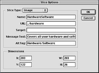 Slices can also be created from Layers. When combined with version 6’s new Layer Sets and Styles, this capability lets you quickly and easily create complex sliced images that are easy to maintain and update. For example, you can use the Styles palette to create Styles for each state of a rollover button to ensure consistency from button to button. Each state can, in turn, be kept in its own layer, and associated states can be grouped into folders. Finally, the Slice tool can be used to assemble the whole mess into a page.