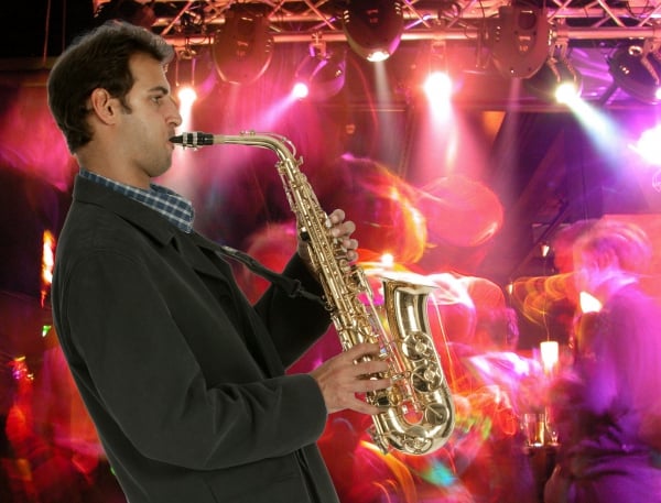 Here’s the result of that blur operation. The man’s head and body have a very slight blur to them, but the sax is blurred as if he’s swinging it upwards, which matches the energy of the background. And because his layer is a Smart Object, it’s possible to double-click the filter in the Layers panel and edit its appearance – or even hide it altogether.
