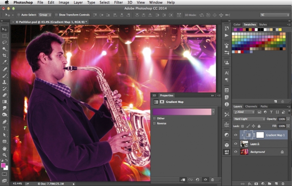 To make his colors blend in with the background, add a Gradient Map from the pop-up menu at the bottom of the Layers panel – and make sure it uses the sax player layer as a Clipping Mask, so it doesn’t affect the background. Use the eyedropper to sample two colors from the background image, and he’ll look much more in like he belongs in this image.
