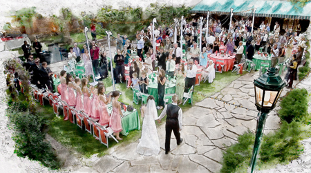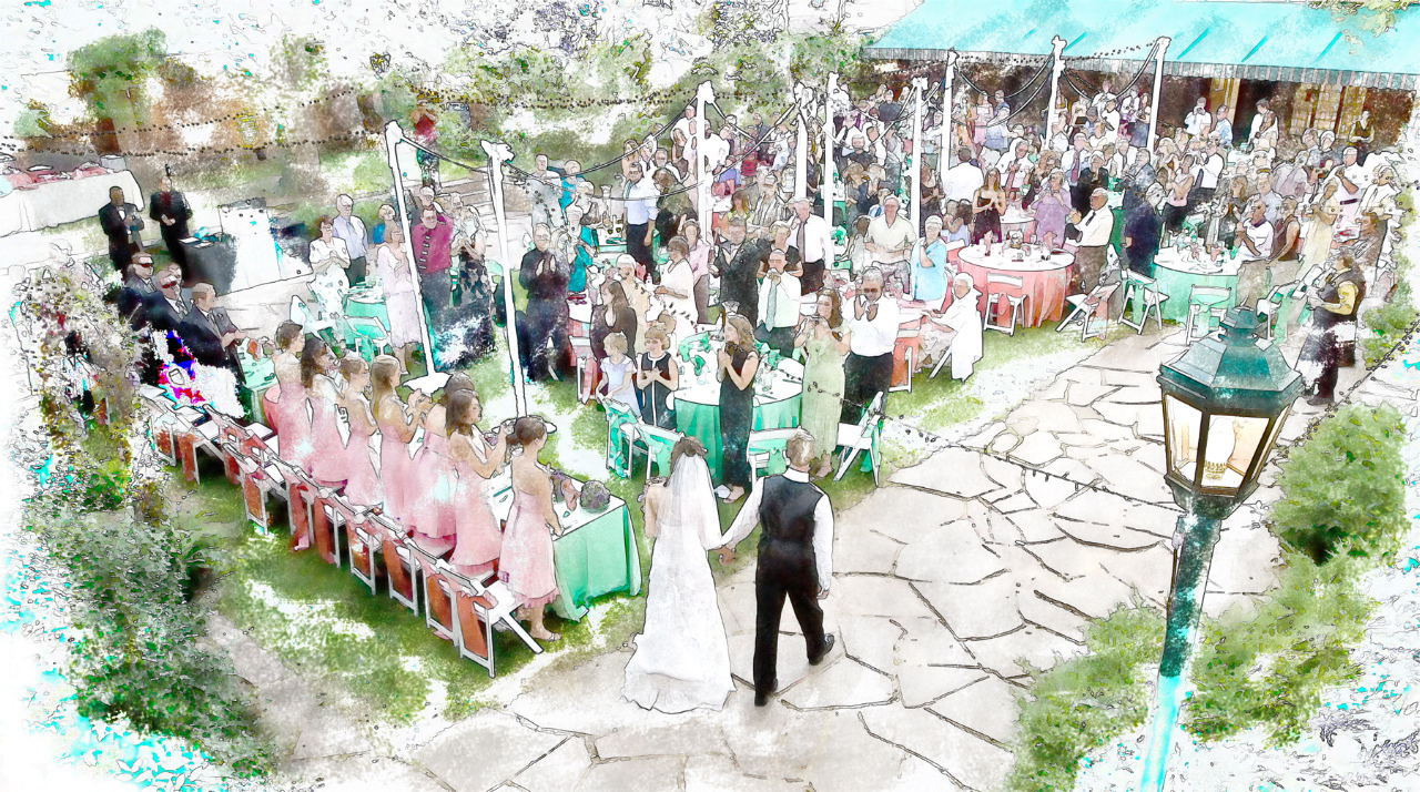 The inspiration for my watercolor-conversion technique, which my company uses for standalone wall art and as storyboard introductory material in our event videos, comes from two intriguing personalities: Karl Lagerfled’s hand-colored fashion sketches for the House of Chanel metamorphose on the screen into breathing models, glamorously enfolded in texture and shimmering fabric. Celebrity interior designer Candice Olson fades her precision architectural renderings into finished interiors with the new furniture, lighting, and accessories all magically in place.