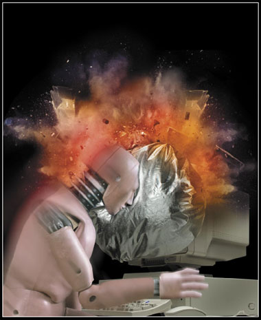 Lund has trained his photographic eye to look for what he calls “parts’ — individual images that can be used over and over again to achieve a particular effect. In the example shown in this excerpt, Lund pulls from his files photos of bricks, explosions, and flames taken at various times during his career. The central image is a crash test dummy photographed for an assignment shoot many years ago.