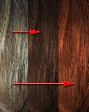 When starting with blond, a simple “dye job” can be provided with a Hue/Saturation adjustment layer. Check the Colorize box and adjust the sliders for the look you want.