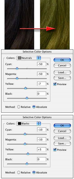 Changing hair color – digitally — is often simply a matter of adding a Hue/Saturation adjustment layer. However, when the hair needs substantial lightening, such as when converting from brunette to blond, the Selective Color command may be more effective.