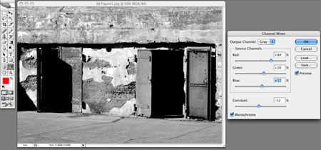 The critical demands of the serious black and white photographer are better served by Photoshop’s Channel Mixer. For this option, I opened my original image, went to Image > Adjustments > Channel Mixer. I checked off Monochrome in the dialog box and adjusted the sliders to suit my taste.