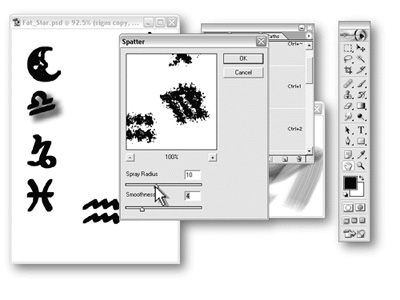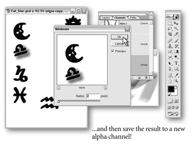 The horoscope symbols are too frail to be filtered with something as strong as the Spatter Effect. You can beef up their outlines with a command that apparently very few people use: the Filter, Other, Minimum command. Contrary to its name, the Minimum command actually adds to the outline of a selection or image area.
