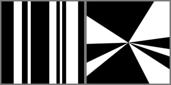 You can easily create rays of light or radiating graphics such as the background in Figure G with the Polar Coordinates filter. To try it out yourself, create a new document that’s 3 inches by 3 inches at 200 ppi. Make a new layer and then select the Rectangular Marquee tool. Draw long rectangular selections as you can see on the left in Figure H. If you want your rays to be irregular, draw lines of varying widths. For regularity, make them all identical in size and in spacing. Then fill the selections with black and deselect them. Once you’ve done that, choose Filter > Distort > Polar Coordinates. In the re-sulting dialog box, choose the Rectangular To Polar option button and then click OK. You’ll have a radiating shape similar to ours on the right in Figure H.