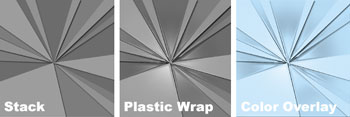 To complete our ray effect in Figure G, we created different radiating shapes by varying the line width and size. We then stacked them and used the Drop Shadow layer style to give them some separation. Next, we made each layer a slightly lighter shade of gray as it got closer to the top. Then, to give the rays some shine, we flattened the layers and applied the Plastic Wrap filter by choosing Filter > Artistic > Plastic Wrap. For the final effect, we applied a cyan Color Overlay. To do so, click the Create New Fill Or Adjustment Layer button at the base of the Layers palette and select Solid Color from the pop-up menu. Then select a color and click OK. Lastly, change the Adjustment layer’s blending mode to Overlay. You can see the various steps in Figure I.