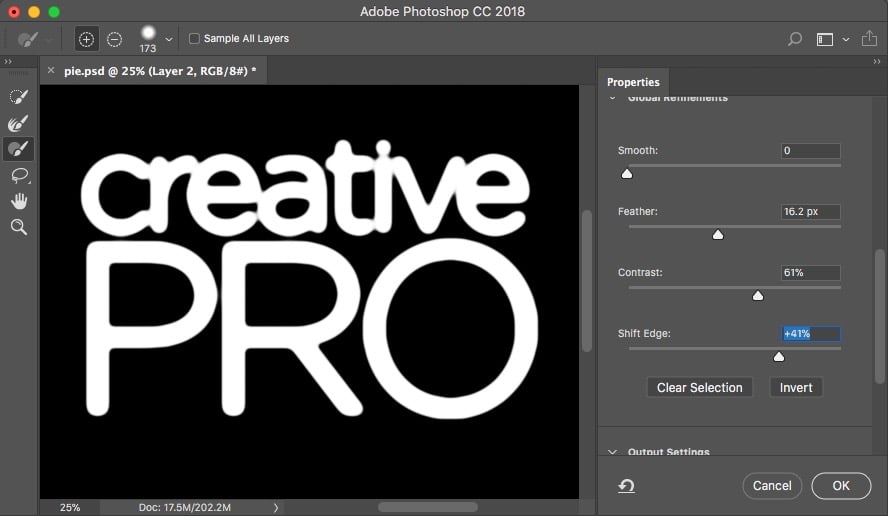 To make the lettering look like it could conceivably be made of pastry, we need to round those edges. Open the Select and Mask dialog, and set the view mode Black & White so you see just the selection area, and not the image. Now increase the Feather amount about half way. This will produce a very soft edge, so increase the Contrast to tighten it up. You may need to drag the Shift Edge slider as well to give the letters some thickness.