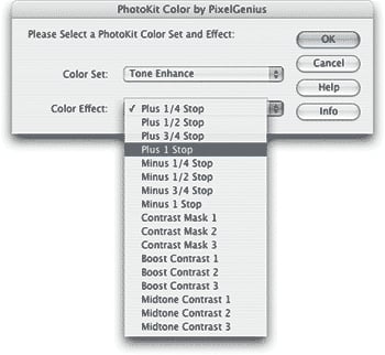 Look for two plug-ins from Pixel Genius. PhotoKit 1.2.3 ($50) is a plug-in for Photoshop 7 and above that replicates 141 analog photographic effects, including warming and cooling filters, toning effects, film grain, and color-to-grayscale conversions using colored filters. The results are spectacularly professional.