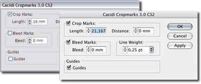 Cacidi Systems’ $25 Cropmarks 3.0 is a plug-in for Adobe InDesign CS2 that automatically creates crop marks around selected item(s). You can control length, offset, and weight of the crop marks. You can download a fully functional version that works for two weeks from the company’s Web site.
