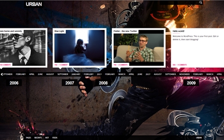 The Urban theme has a distinctive layout. Most themes present content in a vertical list, newest to oldest, while Urban presents portfolio pieces horizontally on a timeline. For designers and photographers this presents an interesting way of showing the evolution of your work over time, or instilling confidence in prospective clients by inferring how busy you’ve been recently.