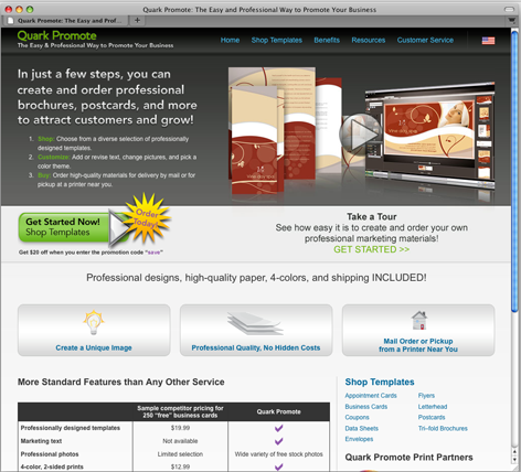 * Professional: Customers can choose from among hundreds of templates to create one marketing piece or an entire matching set of items. Templates are created by professional designers using Quark’s leading design software, QuarkXPress 8, and can be sorted by product or industry.